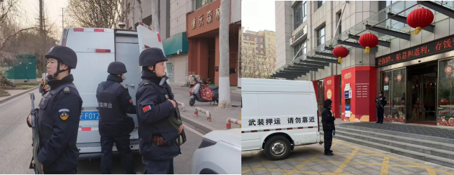 春節期間,押運車組每日準時出車,穿梭于城市街巷,安全準點完成各金融網點款箱接送任務;人防保安員同步跟進,駐守網點門前、巡查自助區域,細致排查每一處安全隱患。從押運線上的風雨兼程到網點門前的日夜守護,他們用默默堅守,守護著這座城市的平安與安寧。